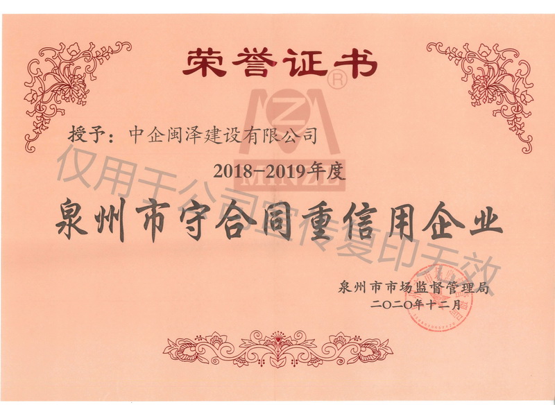 守合同重信用企業(yè)榮譽(yù)證書